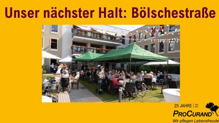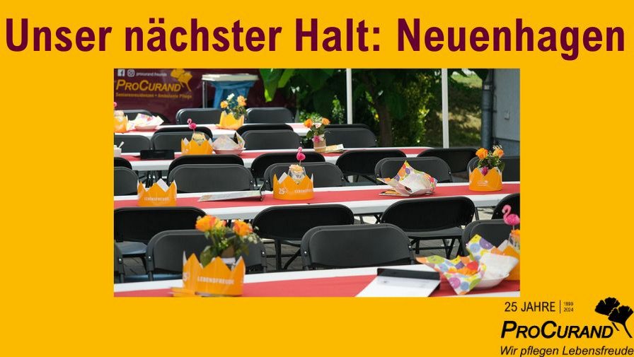 Kreuz und quer durch die ProCurand-Republik: Ein Foodtruck der Schank- & Speisewirtschaft Ost und die Musiker René Krawielicki und Sebastian Schenk alias „Diese Typen“ fuhren ab Mai 2024 zu unseren Standorten in fünf Bundesländern. Unsere Geschäfftsführerinnen waren mit dabei - und dann wurde gefeiert! Es gab ProCurand Burger, Jubiläumstorten und so manch eine Showeinlage der Teams vor Ort. Wir starteten in Sigmaringen in Baden-Würtemberg, fuhren weiter nach Sulzbach-Rosenberg und nach Cham in Bayern. Weitere Stopps waren in Halle, Magdeburg, Senftenberg, Zossen, Dahme/Mark und Grebs. Auch unsere Einrichtungen in Potsdam, Neuenhagen und in Berlin (Charlottenburg und Friedrichshagen) durften nicht fehlen. Danach ging es noch einmal nach Bayern, nach Lam und zum Abschluss nach Eberswalde und Strausberg. Überall feierten unsere tollen Teams zusammen mit den Bewohner*innen und Mieter*innen - voller Lebensfreude!